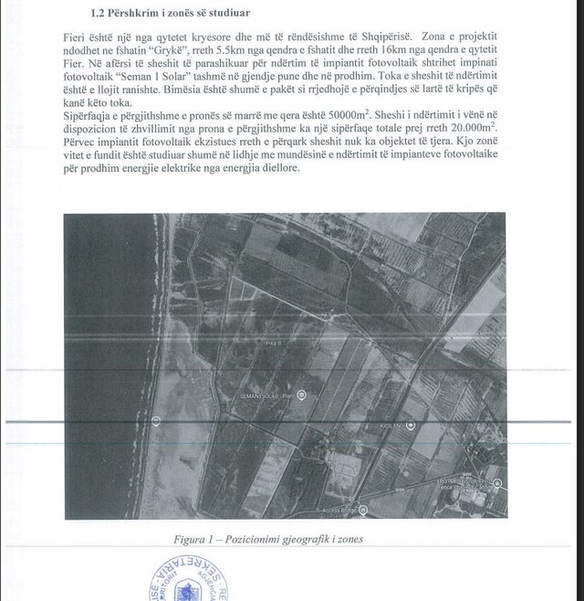 Në të njëjtin vendim, jepet edhe një përshkrim i zonës. Mësohet se leja është dhënë në fshatin “Grykë”, rreth 5.5 km nga qendra e fshatit dhe rreth 16 km nga qendra e qytetit Fier. “Sipërfaqja e përgjithshme e pronës së marrë me qira është 50.000m². Sheshi i ndërtimit i vënë në dispozicion të zhvillimit nga prona e përgjithshme ka një sipërfaqe totale prej rreth 20.000m²”, thuhet në dokumentet shoqëruese.