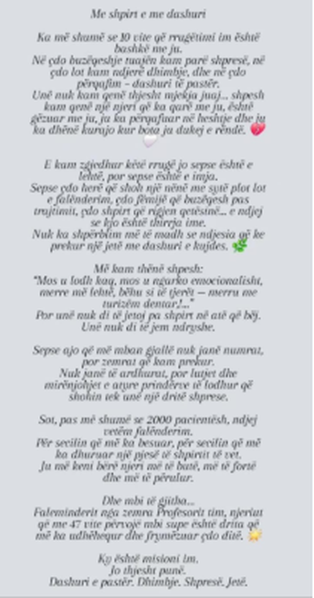Me shpirt e me dashuri Ka më shumë se 10 vite që rrugëtimi im profesional ka qenë pranë jush. Në çdo buzëqeshje kam parë shpresë, në çdo lot kam ndjerë dhimbje, dhe në çdo përqafim – dashuri të pastër. Nuk kam qenë thjesht mjekja juaj. Shpesh kam qenë njeriu që ka qarë me ju, është gëzuar me ju, ju ka përqafuar në heshtje dhe ju ka dhënë kurajë kur bota ju dukej e rëndë. E kam zgjedhur këtë rrugë jo sepse është e lehtë, por sepse është thirrja ime. Sepse çdo herë që shoh një nënë me sy të mbushur me lot falënderimi, çdo fëmijë që buzëqesh pas trajtimit, çdo shpirt që rigjen qetësinë – ndjej se jam aty ku duhet.