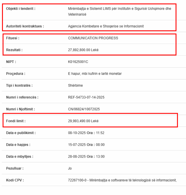 Një tjetër aferë e rëndë financiare përfshin Agjencinë Kombëtare të Shoqërisë së Informacionit (AKSHI) dhe kompaninë “Communication Progress” në pronësi të Gentian Likajt, e cila ka fituar një tender me vlerë 27,892,800 lekë të reja pa TVSH, ose plot rreth 335 milionë lekë të vjetra me TVSH, për mirëmbajtjen e sistemit LIMS të Institutit të Sigurisë Ushqimore dhe Veterinarisë.