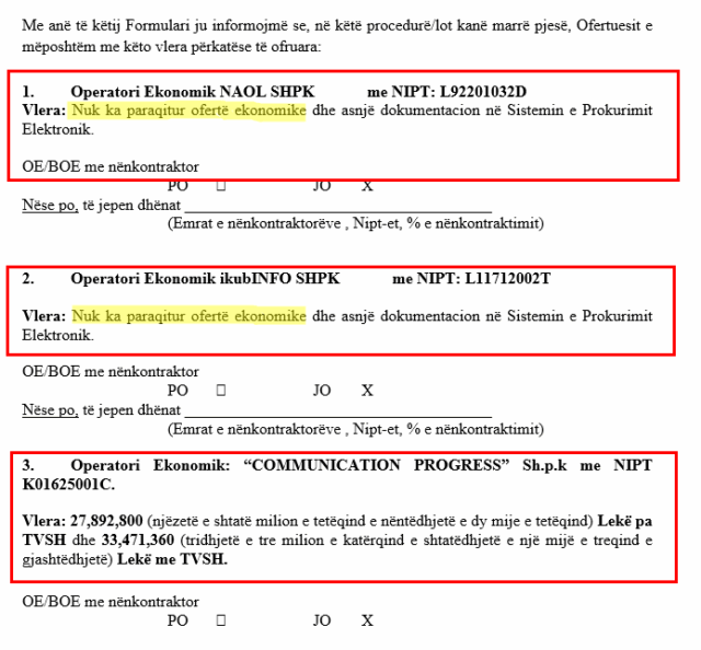 Por skandali nuk mbaron këtu. Nga shqyrtimi i dokumentacionit, rezulton se në tender kanë marrë pjesë tre kompani, por vetëm “Communication Progress” ka dorëzuar ofertë financiare, ndërsa dy të tjerat nuk kanë ofruar asnjë vlerë. Me fjalë të tjera, gara ekzistonte vetëm në letër. Fituesi ishte i paracaktuar.