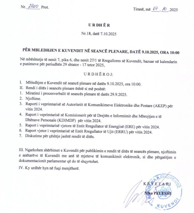 Me 76 vota pro dhe 0 kundër kaloi edhe raporti “Për vlerësimin e veprimtarisë së Komisionerit për të Drejtën e Informimit dhe Mbrojtjen e të Dhënave Personale (KDIMDP) për vitin 2024”.