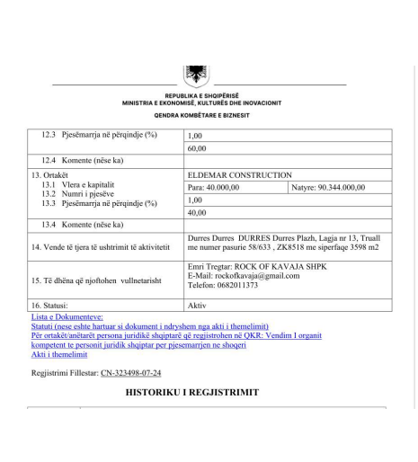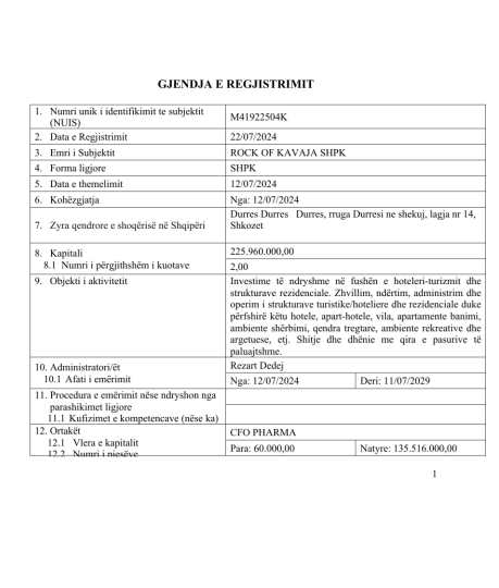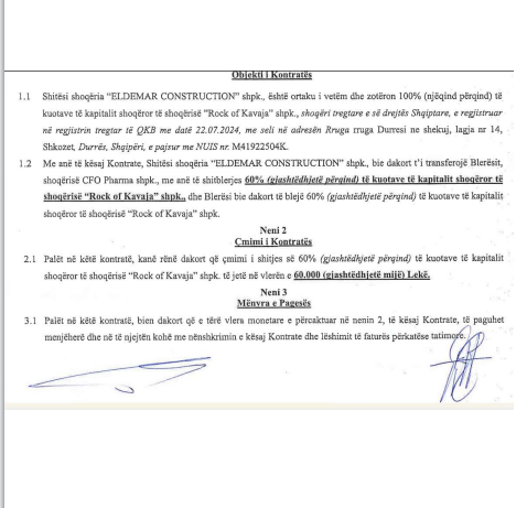 Kështu, në korrik 2024, u regjistrua kompania ‘ROCK OF KAVAJA’ sh.p.k., e cila vetëm dy muaj më pas mori nga vetë Edi Rama lejen për ndërtimin e një hoteli 10–11 katësh me 3 kate nëntokë në zonën e Shkëmbit të Kavajës, me kapital të deklaruar prej 2.2 milionë eurosh.