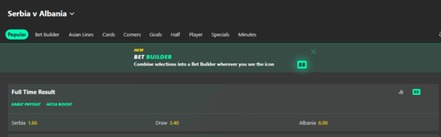 Ekipi serb është favorit për 3 pikët. Një sukses i mundshëm i të besuarve të Stojkovic kuotohet me 1.66.