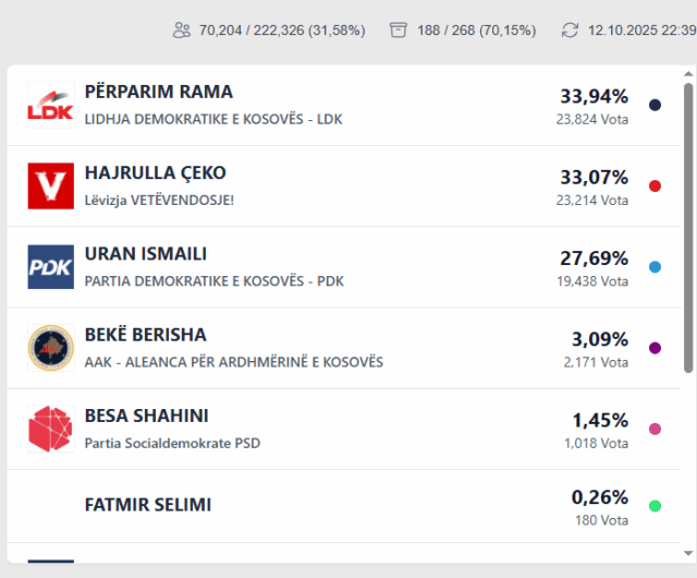 Gjithsesi, teksa janë numëruar 188 kuti nga 266 në total, apo 70.15 të votave, diferenca mes tyre është shumë e ngushtë. Përparim Rama i LDK-së deri më tani ka 23 824 vota apo 33,94% të votave, ndërsa Hajrulla Çeko ka 23 214 vota apo 33,07%, ku diferenca mes tyre aktualisht është vetëm rreth 600 vota.