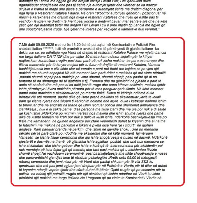 Po udhëtoja nga Vlora në drejtim të restorant “Katalea Palace” me mjetin Lancia, me targa italiane DN171ZF. Pa vajtur 30 metra, kam ndezur sinjalin për t’u kthyer majtas, kam kontrolluar rrugën, pasi kam parë që nuk kisha makina as para as mbrapa dhe fillova manovrën për t’u kthyer majtas, për t’u futur në drejtim të restorantit. Vanesa, bashkëjetuesja ime, e cila ishte ulur në vendin e parë, më thotë me kujdes se po vjen një makinë me shumë shpejtësi.