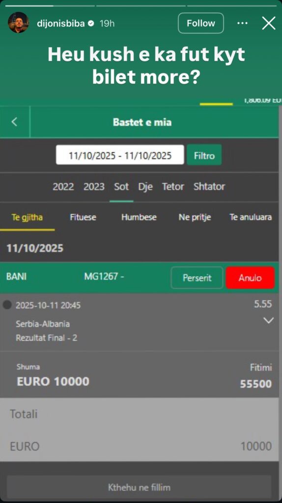 Mbrëmjen e ndeshjes Serbi-Shqipëri, Dijonis Biba shpërndau në InstaStory një skedinë ku shfaqej një bast i vendosur prej 10,000 euro për fitoren e kuqezinjve.
