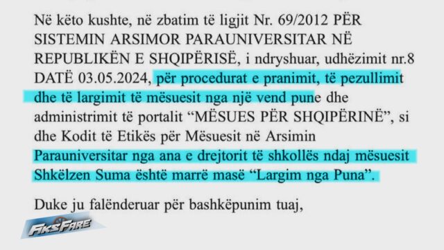 Fiks Fare u interesua pranë Drejtorisë Rajonale të Arsimit Parauniversitar Durrës, e cila reagoi menjëherë duke ngritur një grup pune për të verifikuar ankesat e nxënësve dhe prindërve. Pas këtij hetimi administrativ u konstatuan shkelje të rënda të etikës në punë nga ana e mësuesit Suma. Në bazë të ligjit për Arsimin Parauniversitar si dhe kodit të etikës ndaj mësuesit Shkëlzen Suma u morë masa disiplinore “ Largim nga Puna” .
