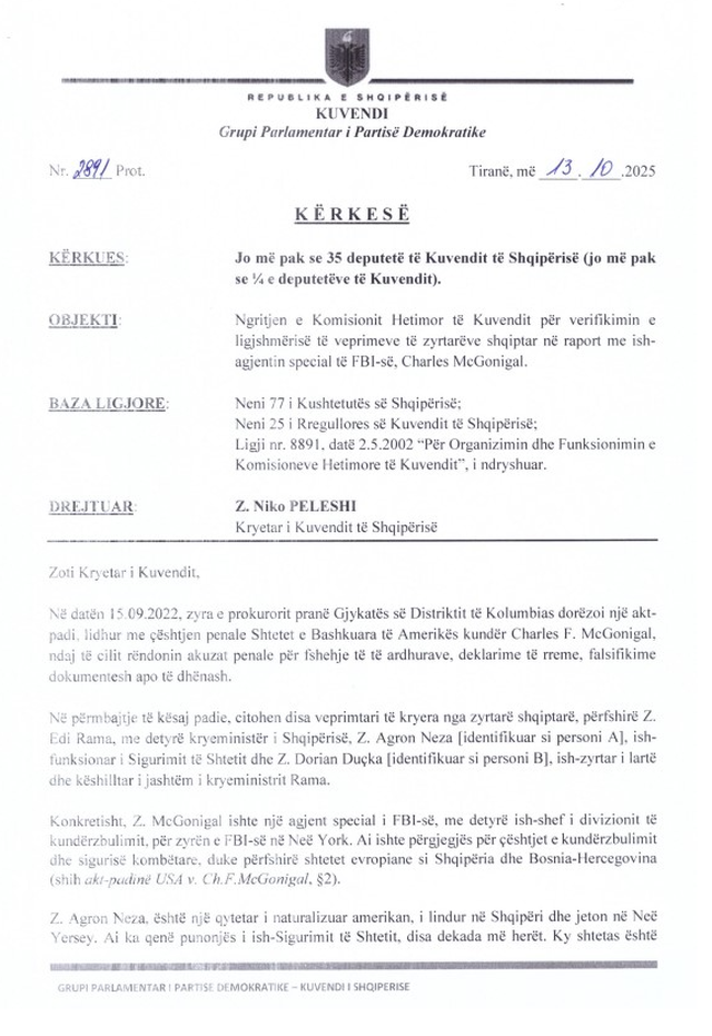 Partia Demokratike ka paraqitur zyrtarisht në Kuvend një kërkesë për ngritjen e një Komisioni Hetimor Parlamentar, që do të hetojë ligjshmërinë e veprimeve të zyrtarëve shqiptarë në raport me ish-agjentin e lartë të FBI-së, Charles McGonigal.