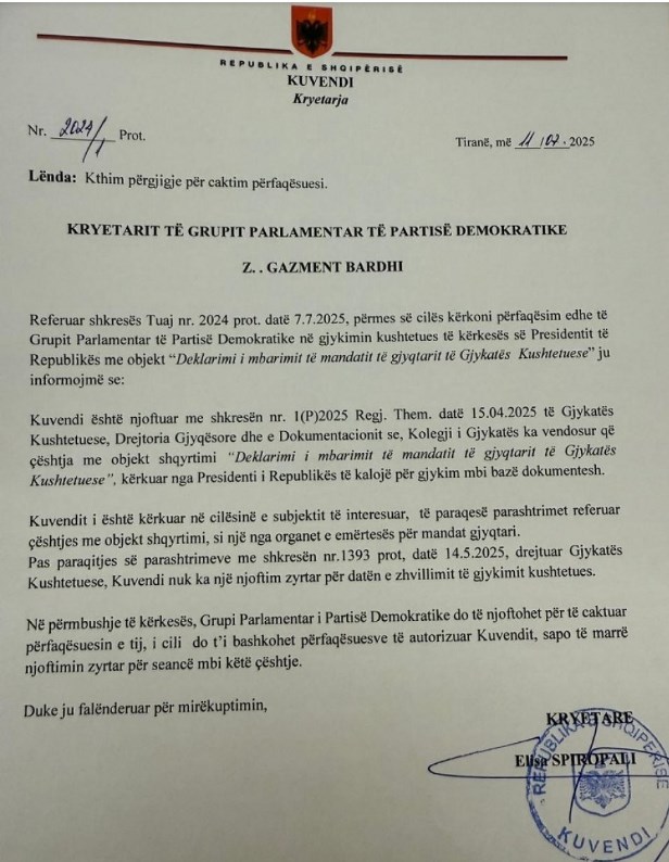 Në shtator të vitit të kaluar, kryeparlamentarja e kohës, Spiropali, shpalli vakancën në Gjykatën Kushtetuese, pas dorëheqjes së gjyqtares Elsa Toska. Procedura për zëvendësimin e Toskës u ndërpre nga Këshilli i Emërimeve në Drejtësi, me justifikimin se mandati i saj dhe i të gjithë gjyqtarëve kushtetues, do të shqyrtohen nga vetë kjo gjykatë, bazuar mbi një kërkesë të Presidentit Bajram Begaj.