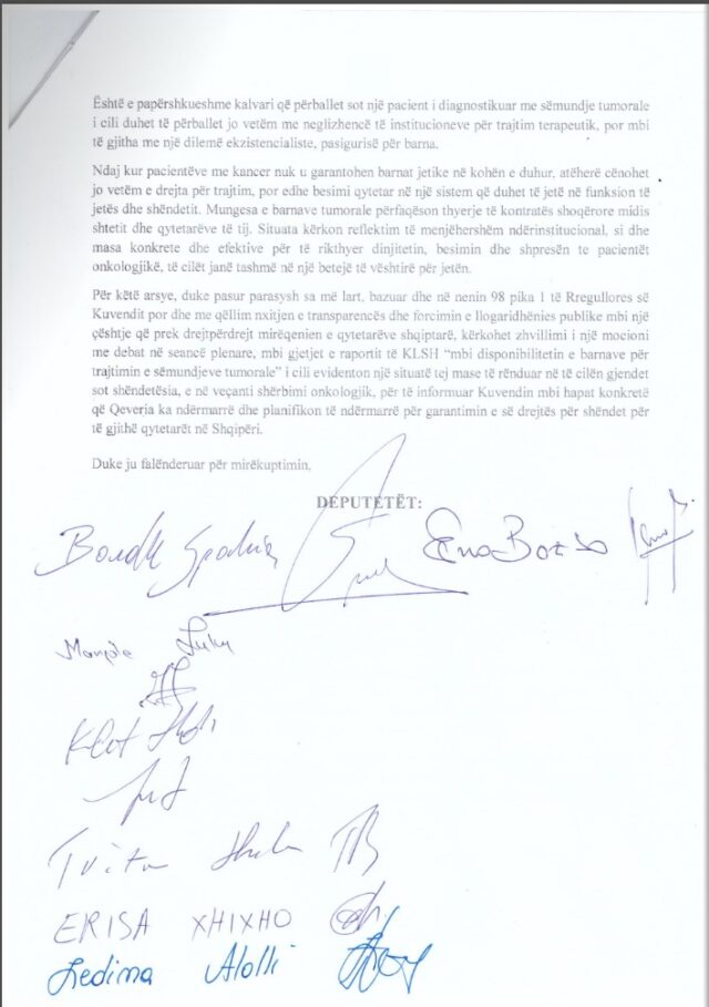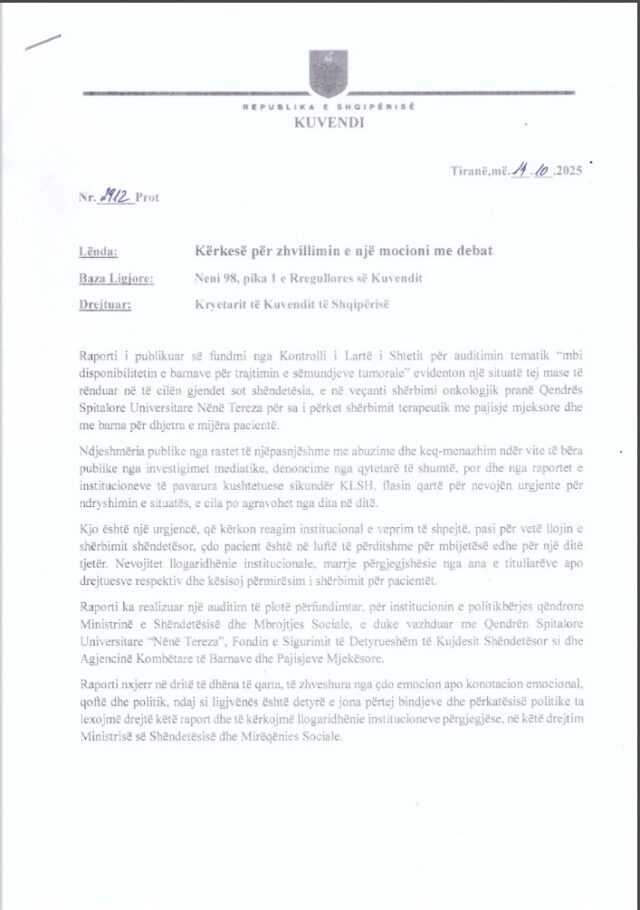 Në kërkesë thuhet se raporti i fundit i Kontrollit të Lartë të Shtetit ka evidentuar situatën e rëndë në të cilën ndodhet sot shëndetësia, veçanërisht shërbimi onkologjik.