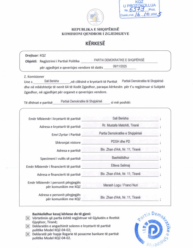 Partia Demokratike ka paraqitur sot në KQZ kërkesën për t’u regjistruar si subjekt zgjedhor në zgjedhjet e pjesshme vendore që do të mbahen në 5 bashki në vend.