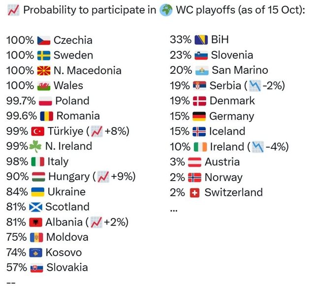 Sipas të dhënave më të fundit të publikuara nga Football Meets Data, shanset e ekipeve për të marrë pjesë në Play Off-in e Kupës së Botës kanë pësuar disa ndryshime të rëndësishme me Shqipërinë në ngritje dhe Serbinë në rënie.