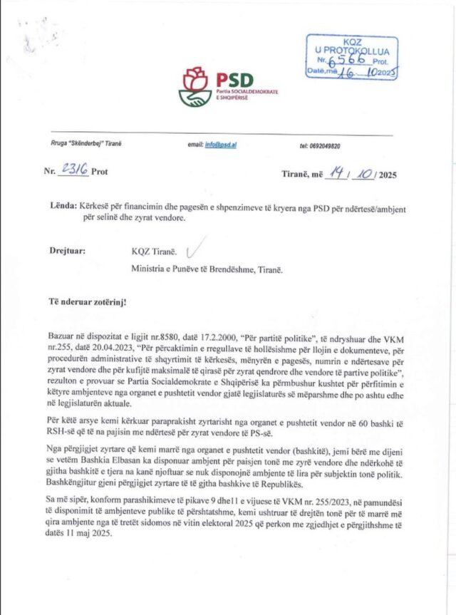 “Kemi kërkuar paraprakisht zyrtarisht nga organet e pushtetit vendor në 60 bashki të RSH-së që të na pajisin me ndërtesë për zyrat vendore të PSD-së. Nga përgjigjet zyrtare që kemi marrë nga organet e pushtetit vendor (bashkitë), jemi bërë me dijeni se vetëm Bashkia Elbasan ka disponuar ambient për pajisjen tonë me zyrë vendore dhe ndërkohë gjitha bashkitë e tjera na kanë njoftuar se nuk disponojnë ambiente të lira për subjektin tonë politik”, thuhet në kërkesën e PSD-së.
