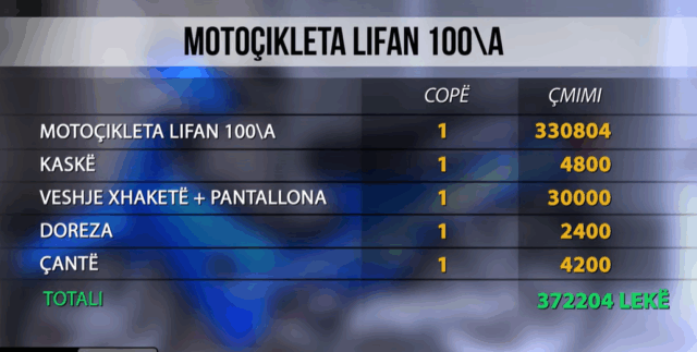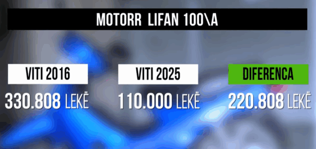 Ky motor që shihni më poshtë i përket markës japoneze “Lifan” i tipit 100\A, Top Channel ka siguruar një faturë dore se motoçikleta që i shpëtoi jetën bagëtive para vitesh ka kushtuar 330.808 mln lekë të reja.