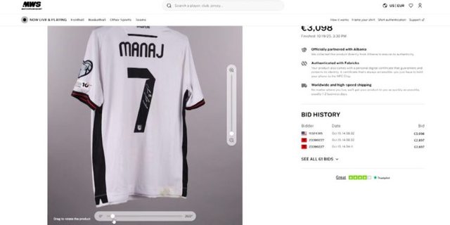 Fanela që Rey Manaj përdori në sfidën me Serbinë, e luajtur më 11 tetor në Leskovc, u ble për thuajse 3,100 euro në një ankand të faqes MatchWornShirt.