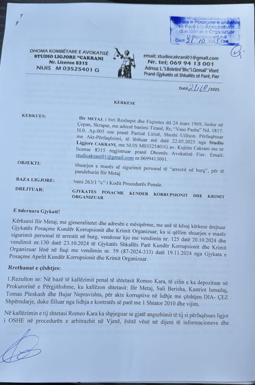 Avokati i tij, Kujtim Cakrani, i është drejtuar sërish Gjykatës së Posaçme Kundër Korrupsionit dhe Krimit të Organizuar me një kërkesë për shuarjen e masës së sigurisë ndaj tij. Kërkesa është dorëzuar një vit pas vendimit të GJKKO-së, e cila më 21 tetor 2024 miratoi kërkesën e SPAK për arrestimin e Metës.