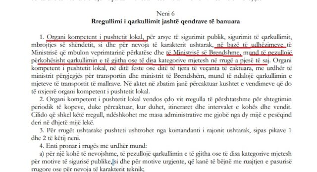 Ndërkohë, në nenin 6 të Kodit Rrugor thuhet: “Organi kompetent i pushtetit lokal, për arsye të sigurimit publik, sigurimit të qarkullimit, mbrojtjes së shëndetit, si dhe për nevoja të karakterit ushtarak, në bazë të udhëzimeve të Ministrisë që mbulon veprimtarinë përkatëse dhe të Ministrisë së Brendshme, mund të pezullojë përkohësisht qarkullimin e të gjitha ose të disa kategorive mjetesh në rrugë a pjesë të saj…”.