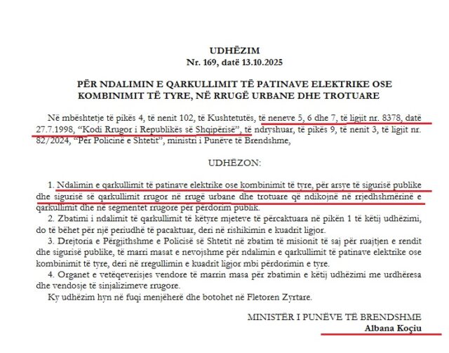 Në Udhëzimin nr. 169. Dt. 13 Tetor 2025, Ministrja e Brendshme e bazon vendimin e saj për bllokimin e monopatinave në nenet 5, 6 dhe 7 të Kodit Rrugor.