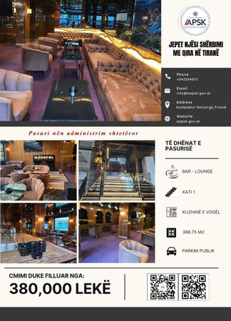 Siç njofton agjencia, bëhet fjalë për një lokal me sipërfaqe 388.75 m², ndodhur në katin e parë te rruga “Myslym Shyri”, një nga zonat më të preferuara të Tiranës, i cili është në administrim shtetëror dhe del për qira për 380,000 Lekë/muaj.