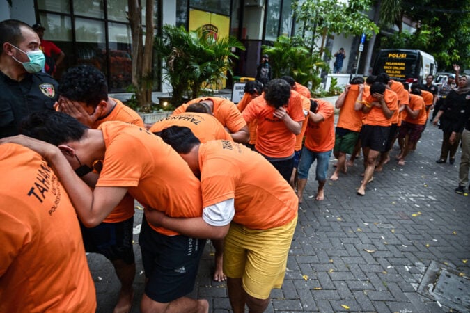 Policia arrestoi 34 burra në Surabaya, qytetin e dytë më të madh të vendit, dhe pasi ua lidhën duart me kravata, ata u nxorën në rrugë.