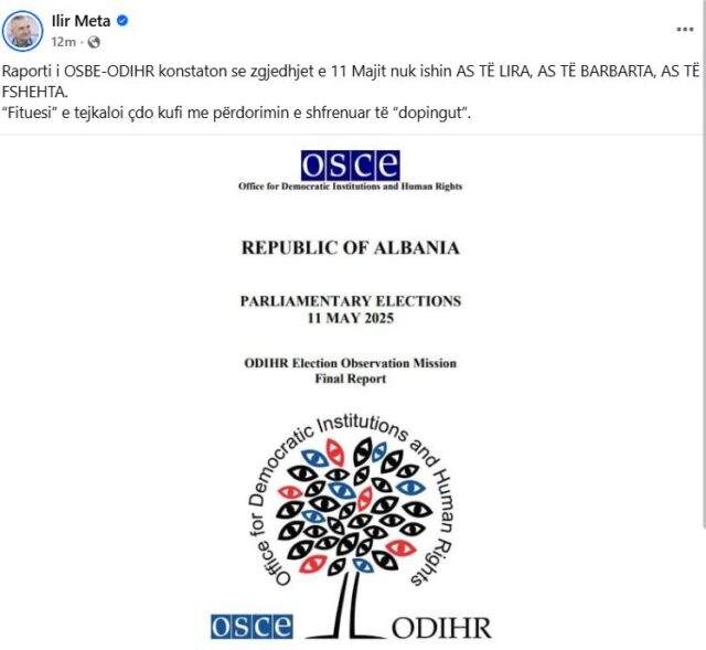 Presidenti i Partisë së Lirisë, Ilir Meta, ka reaguar sot pas raportit përfundimtar të paraqitur nga OSBE-ODIHR për zgjedhjet e 11 majit.