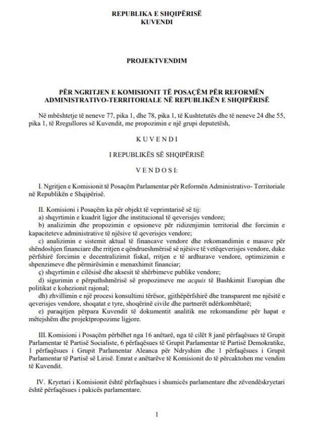 Kuvendi i Shqipërisë ka paraqitur projektvendimin për ngritjen e Komisionit të Posaçëm Parlamentar për Reformën Territoriale.