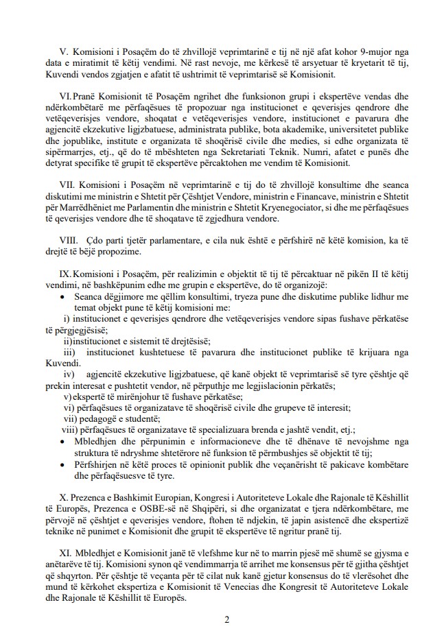 Numri, afatet e punës dhe detyrat specifike të grupit të ekspertëve përcaktohen me vendim të Komisionit. VII. Komisioni i Posaçëm në veprimtarinë e tij do të zhvillojë konsultime dhe seanca diskutimi me ministrin e Shtetit për Çështjet Vendore, ministrin e Financave, ministrin e Shtetit për Marrëdhëniet me Parlamentin dhe ministrin e Shtetit Kryeneg.