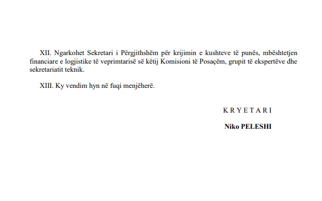 Komisioni i Posaçëm për Territorialen do të përbëhet nga 16 anëtarë, nga të cilët 8 janë përfaqësues të Grupit Parlamentar të Partisë Socialiste, 6 përfaqësues të Grupit Parlamentar të Partisë Demokratike, 1 përfaqësues i Grupit Parlamentar Aleanca për Ndryshim dhe 1 përfaqësues i Grupit Parlamentar të Partisë së Lirisë. Emrat e anëtarëve të Komisionit do të përcaktohen me vendim të Kuvendit.