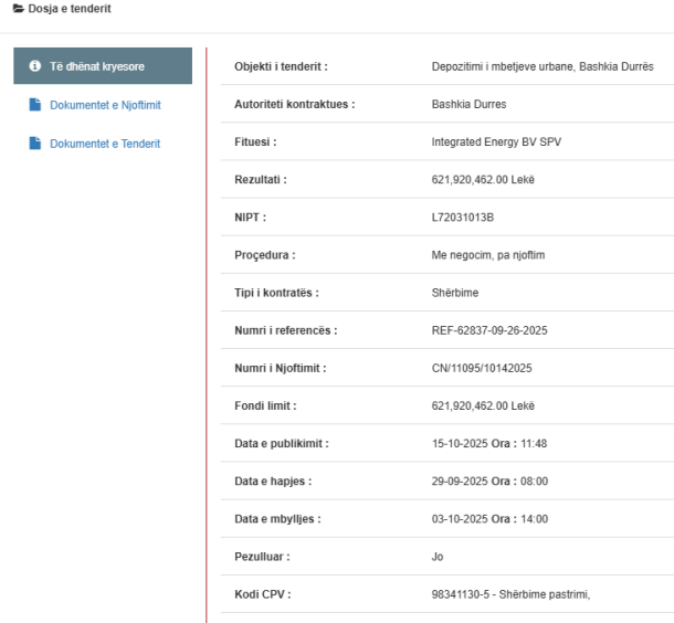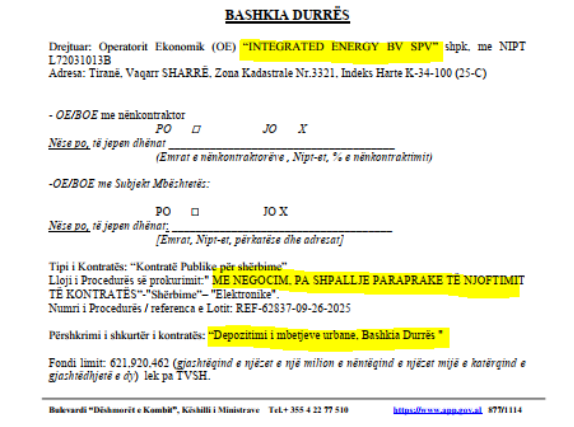 Sipas saj, më 8 tetor 2021, Bashkia Durrës ka lidhur një kontratë me negocim pa shpallje me kompaninë Integrated Energy BV SPV, me vlerë rreth 13.5 milionë euro për katër vjet, për depozitimin e rreth 320 mijë ton mbetjesh.