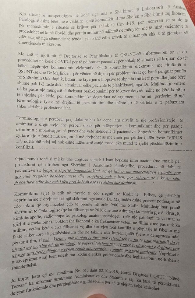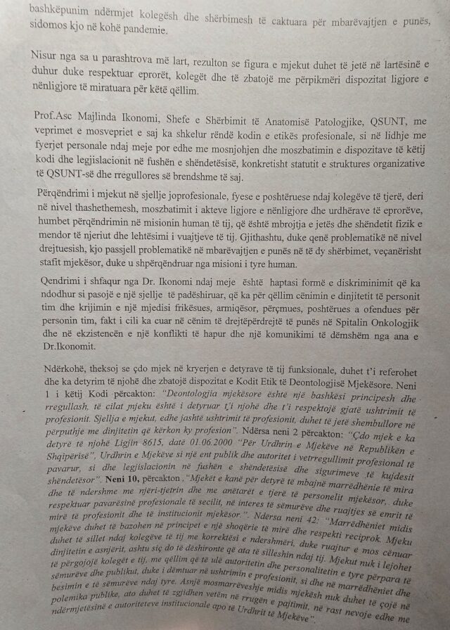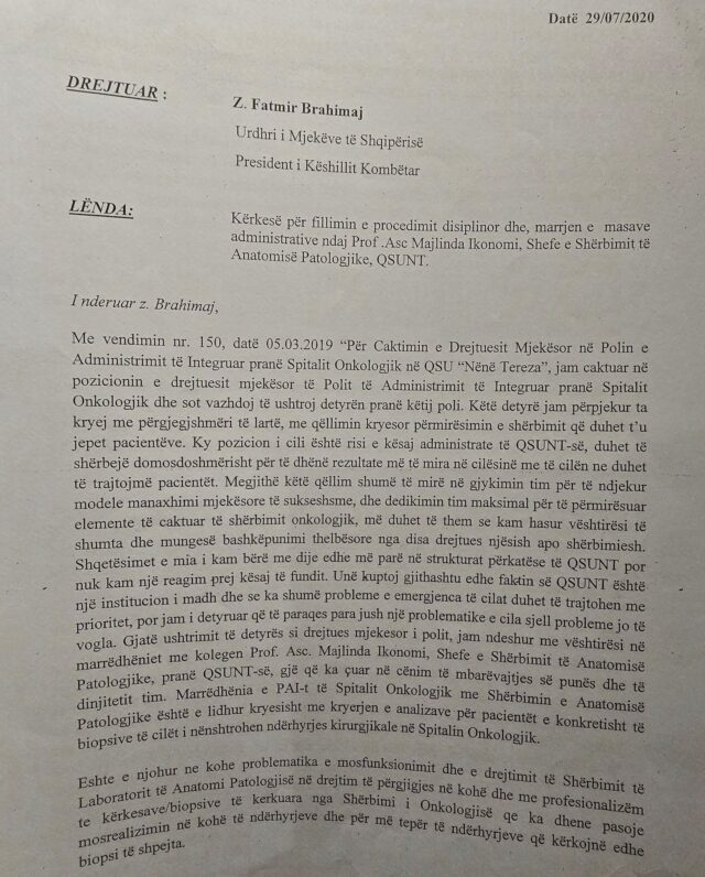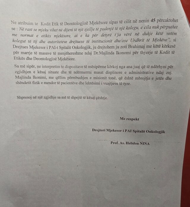 Kirurgu Helidon Nina, (punon në Spitalin Onkologjik) në një shkresë zyrtare drejtuar Urdhrit të Mjekut, kërkon nisjen e procedimit disiplinor ndaj Shefes së Anatomisë Patologjike, Majlinda Ikonomi.