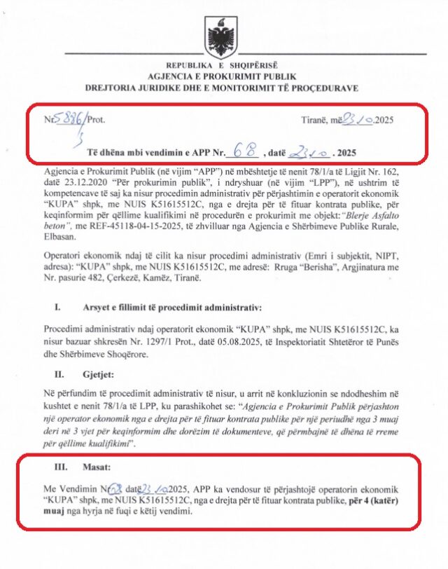 Agjencia e Prokurimit Publik (APP), ka miratuar në 23 Tetor 2025 vendimin nr. 68, ku është vendosur “Përjashtimi i subjektit Kupa shpk nga e drejta për të fituar kontrata publike për 4 muaj”.