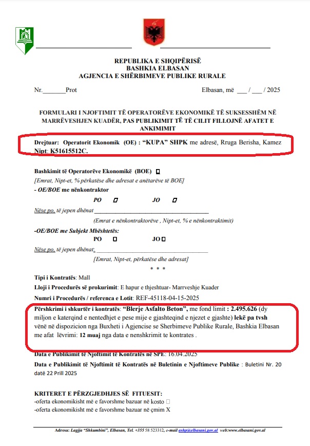 Agjencia e Prokurimit Publik (APP), ka konstatuar se kompania në pronësi të sipërmarrësit Shkëlqim Kupa, ka paraqitur të dhëna të pavërteta për t’u kualifikuar në një tender të zhvilluar në maj të vitit 2025 nga Agjencia e Shërbimeve Publike Rurale në Elbasan.