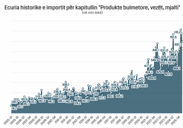 Të dhënat zyrtare tregojnë se nga korriku deri në shtator, vlera totale e importeve në këtë kategori ka arritur 2.28 miliardë lekë, me 815 milionë lekë në korrik, 773 milionë në gusht dhe 697 milionë lekë në shtator, niveli më i lartë i regjistruar ndonjëherë për këtë periudhë.