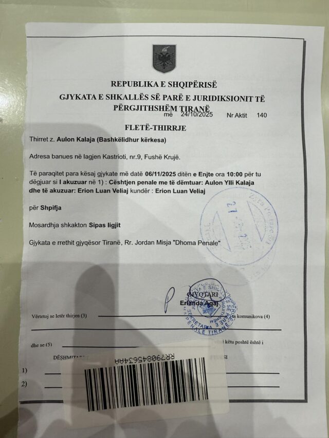 Erion Veliaj, nëse të ka mbetur një fije burrëri, të pres në gjykatë, me datë 6 nëntor. Mos mungo se do të vërtetoj çdo fjalë që kam thënë për ty! Nëse nuk vjen në gjyq, turpi të ndjekë ty nga pas…”– shkruan ai teksa publikon edhe fletëthirrjen që i ka ardhur nga gjykata e shkallës së parë në Tiranë.