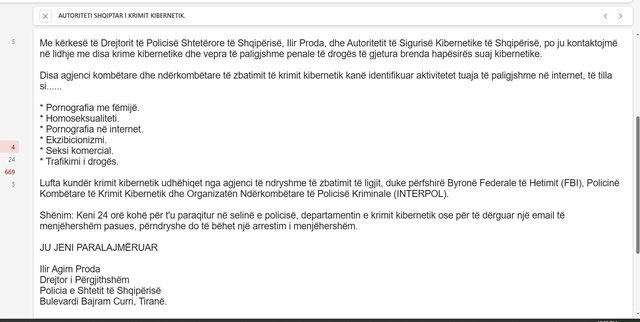 “Disa agjenci kombëtare dhe ndërkombëtare të zbatimit të krimit kibernetik kanë identifikuar aktivitetet tuaja të paligjshme në internet, të tilla Pornografia me fëmijë. Homoseksualiteti. Pornografia në internet. Ekzibicionizmi. Seksi komercial. Trafikimi i drogës”, shkruhet në e-mail.