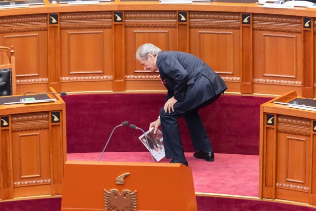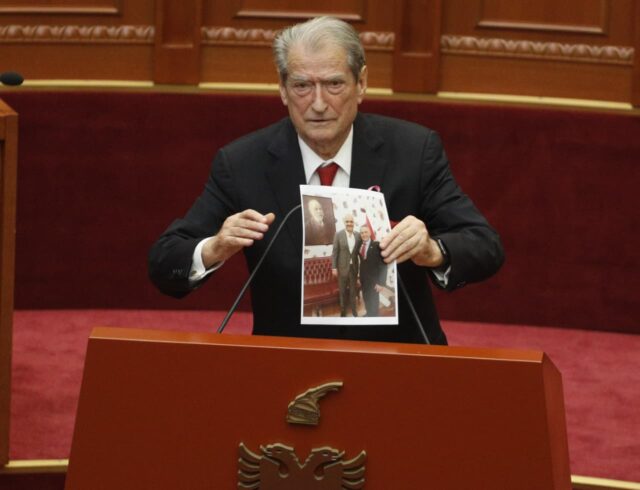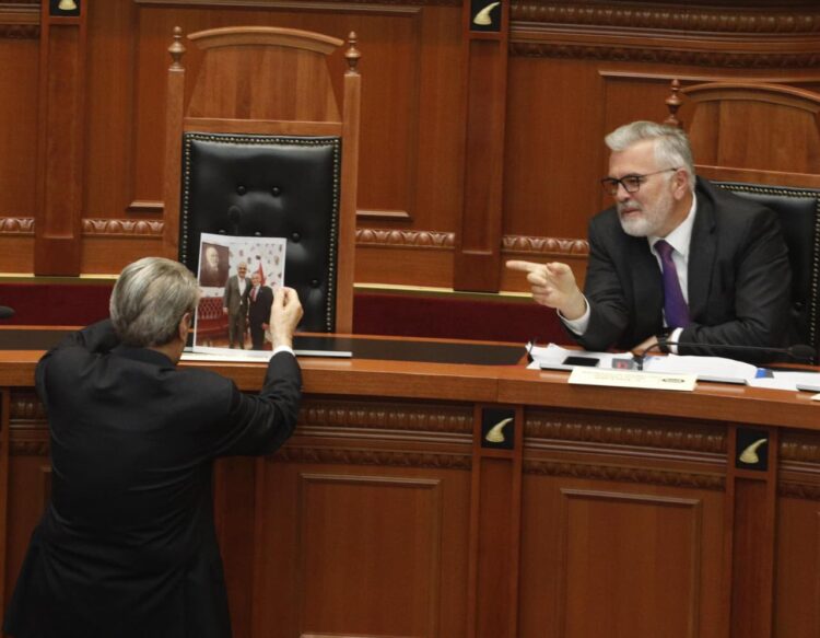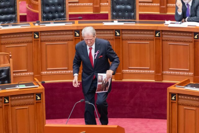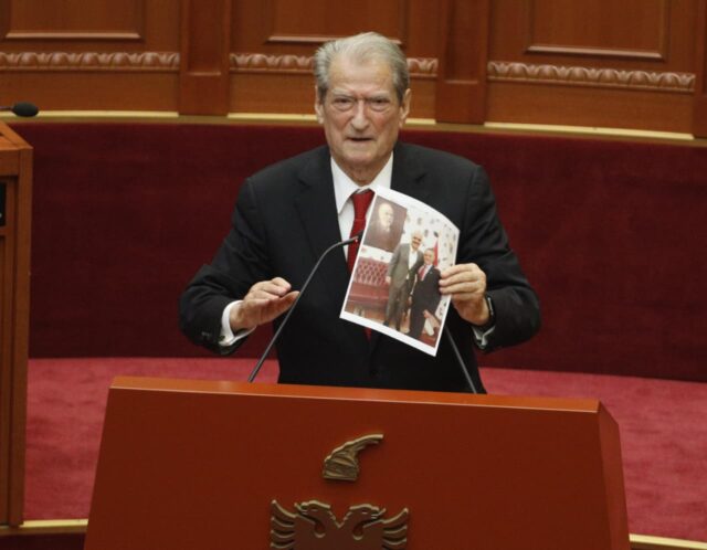 Sali Berisha është shfaqur në Kuvend me një foto të Edi Ramës me ish-agjentin e FBI-së, Charles McGonigal, të cilën e ka vendosur tek vendi i kryeministrit.