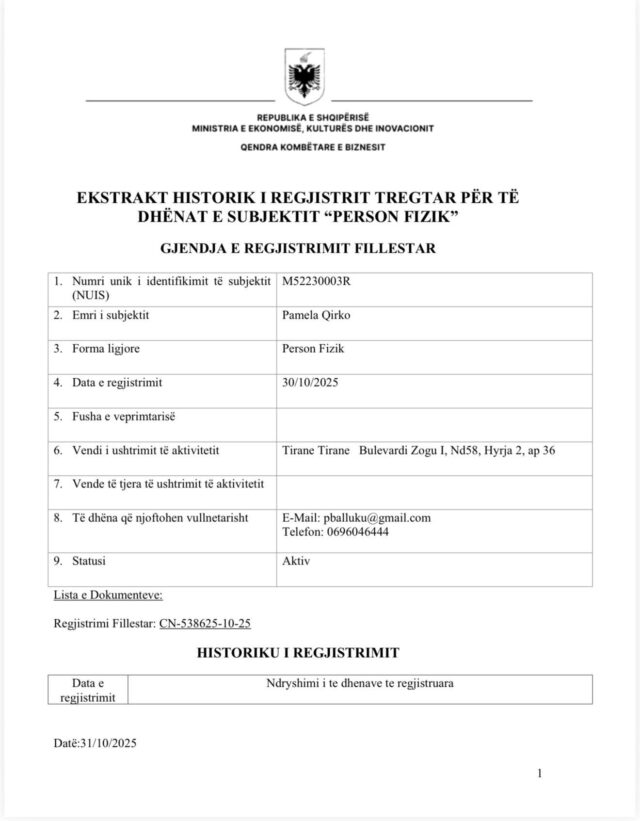 Sali Berisha ka denoncuar përmes qytetarit dixhital se avokatja Pamela Qirko është regjistruar vetëm dje në QKB si person fizik, pa asnjë lloj aktiviteti.