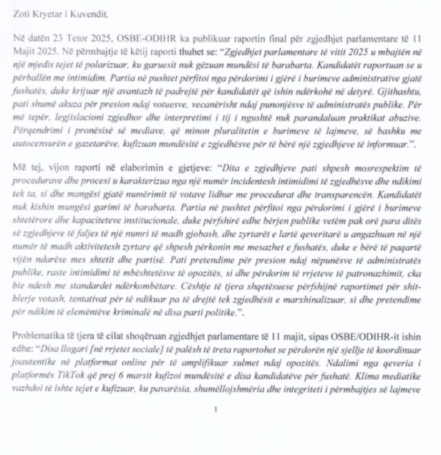 “Pasur parasysh gjetjet dhe konkluzonet e raportit final të OSBE-ODIHR-it për zgjedhjet parlamentare të 11 Majit 2025, veçanërisht ato që lidhen me shkeljen e parimit të barazisë së palëve në garë, vlerësojmë se është detyra jonë si deputetë të Kuvendit të Shqipërisë, që të iniciojmë dhe nxisim debatin parlamentar për problematikat, mangësitë dhe standardet e proceseve zgjedhore në vendin tonë, si një kontribut edhe për punën e Komisionit Parlamentar për Realizimin e Reformës së Zgjedhore të miratuar rishtazi me konsensus ndërpartiak”,- thuhet ndër të tjera në kërkesë.