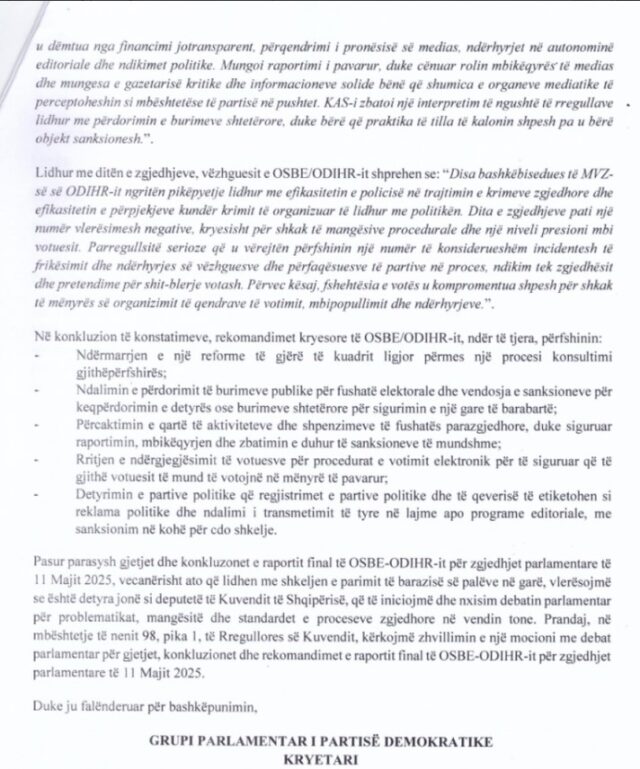 Grupi Parlamentar i Partisë Demokratike, ka kërkuar zhvillimin e një mocioni me debat në Kuvend me fokus gjetjet e raportit final të OSBE-ODIHR të publikuar javën e shkuar.