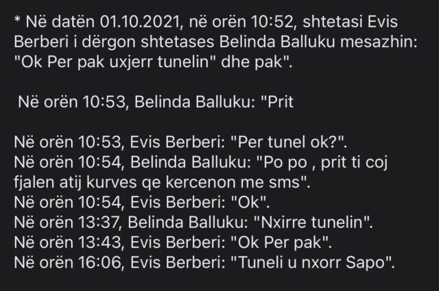 “Miq, ju lutem lexojeni këtë shkëmbim mesazhesh midis Rahmetlije Ballukut dhe Ervis Berberit për të kuptuar rolin e Ramës në këtë aferë që ajo e cilson: atij k*urves.”- shkruan Berisha.