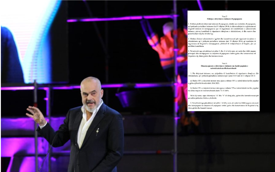 Më konkretisht, sipas të dhënave të ministrisë së Financave, detyrimet e krijuara para dhjetorit 2014, janë plot 55 miliardë lekë ose 552 milionë euro. Brenda kësaj shume, 45 milionë euro janë detyrime për kontributet e sigurimeve shoqërore dhe shëndetësore, të cilat nuk falen. Pra mbi 500 milionë euro detyrime të para dhjetorit 2014, falen automatikisht.