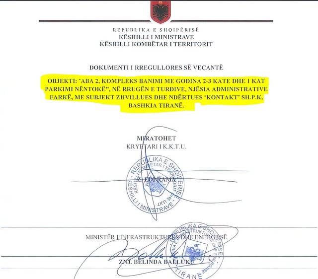 Sipas dokumenteve të zbardhura së fundmi nga Këshilli Kombëtar i Territorit dhe Ujit, ai ka marrë leje për kompleksin “ABA 2”, i përbërë nga gjashtë godina, secila me 2-3 kate dhe një kat nëntokë, në një truall prej rreth 3,600 m² në rrugën e “Turdive”, pranë Liqenit të Farkës.