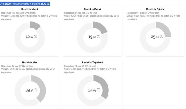 Deri në orarin zyrtar të mbylljes sipas KQZ pjesëmarrja në zgjedhje ka qenë 18.72 %. Përkatësisht 12.54% e qytetarëve kanë votuar në Vlorë, 19.98% në Berat, 25% në Cërrik, 39.36% në Mat dhe 34.63% në Tepelenë.