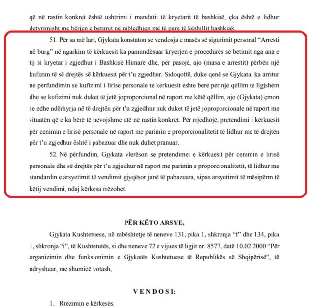 Në vlerësimin e Gjykatës Kushtetuese, “masa e sigurimit personal “Arresti në burg” e vendosur ndaj kërkuesit nuk duket joproporcionale në kontekstin e rrethanave të çështjes, në raport të drejtë me veprën penale për të cilën ai akuzohet dhe rregullat procedurale të KPP-së për caktimin e masës së sigurimit personal “Arresti në burg” (pika 49 e vendimit nr. 19, dt. 21.03.2024).