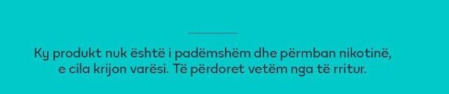 Në qendër të fotos dhe gërma të mëdha dhe të zeza është oferta, ndërsa me të bardhë, një fund shkruhen këto fjalë: Ky produkt nuk është i padëmshëm dhe përmban nikotinë, e cila krijon varësi. Të përdoret vetëm nga të rritur!