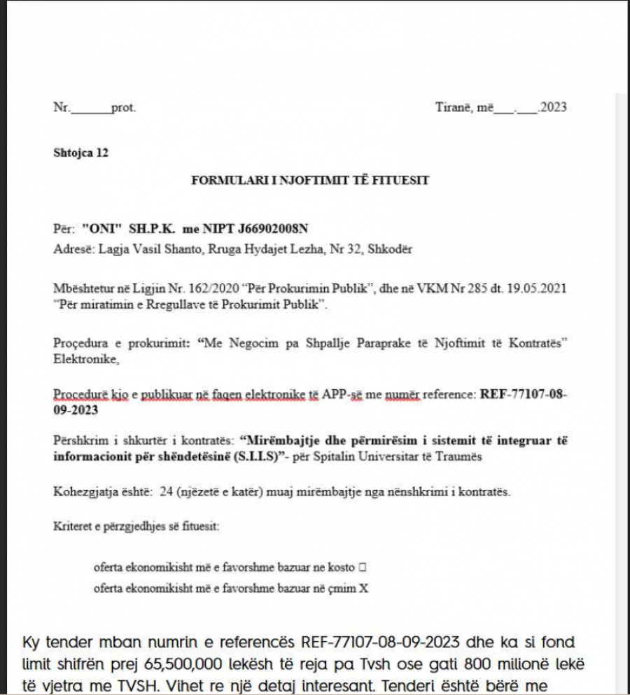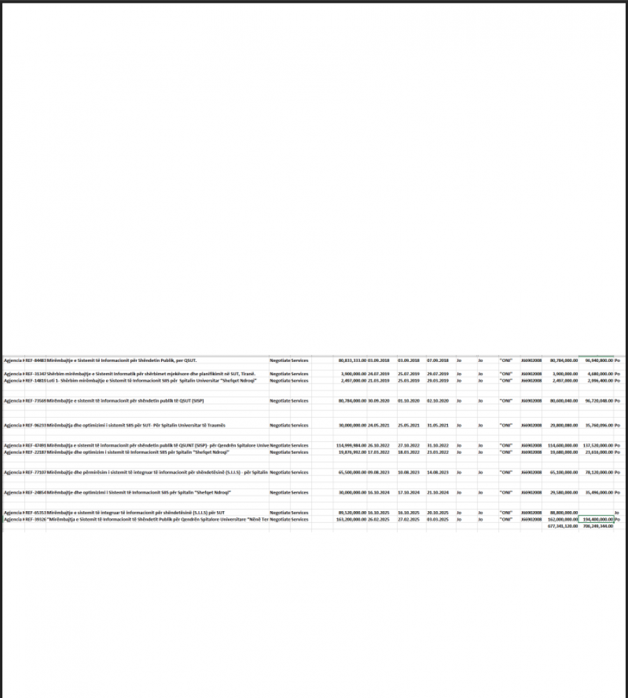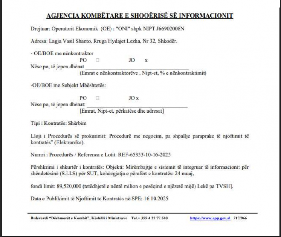 Zëdhënësja e Antikorrupsionit në Partinë Demokratike, Genta Vangjeli, deklaron se Agjencia Kombëtare e Shoqërisë së Informacionit, nën varësinë e kryeministrit Edi Rama, ka lidhur gjatë periudhës 2018-2025, 11 kontrata për mirëmbajtjen e sistemit të informacionit shëndetësor, pa garë dhe pa transparencë, duke përdorur të njëjtin operator ekonomik në çdo rast, “ONI SHPK”.