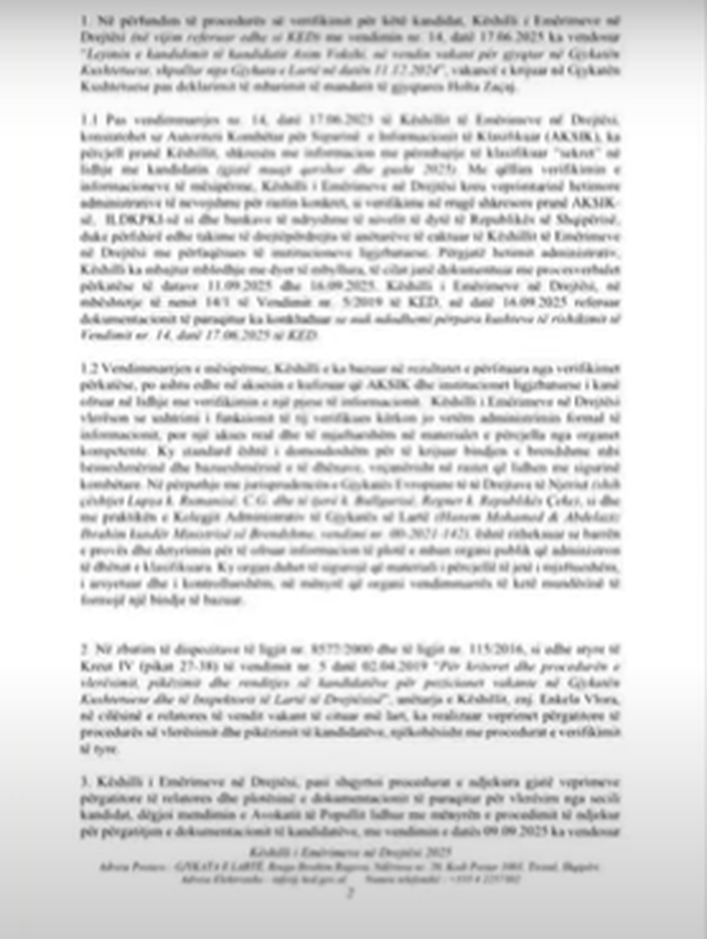Pas vendimmarrjes nr. 14, datë 17.06.2025 të Këshillit të Emërimeve në Drejtësi, konstatohet se Autoriteti Kombëtar për Sigurinë e Informacionit të Klasifikuar (AKSIK) ka përcjellë pranë Këshillit një shkresë me informacion me përmbajtje të klasifikuar “sekret”, në lidhje me kandidatin (gjatë muajit qershor dhe gusht 2025).