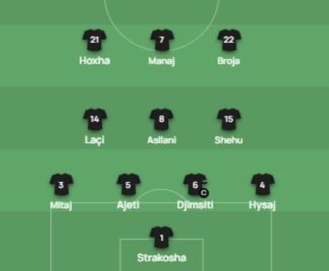 Në portë është Strakosha, ndërsa mbrojtja është e përbërë nga Hysaj, Gjimshiti, Ajeti dhe Mitaj.