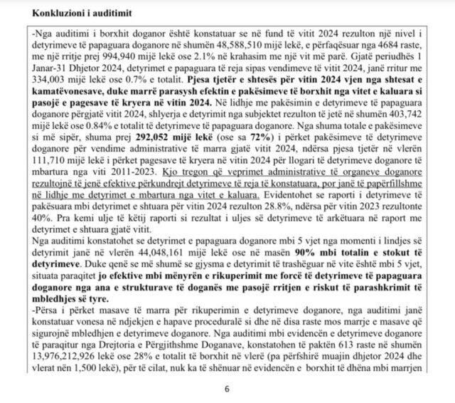 Të dhënat tregojnë se në fund të vitit 2024, detyrimet e papaguara doganore kanë arritur në rreth 48.6 miliardë lekë, të shpërndara në 4.684 raste, duke regjistruar një rritje prej 2.1% krahasuar me vitin 2023.