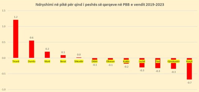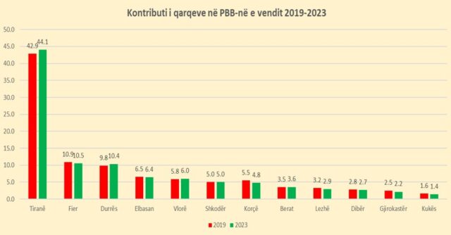 Në krahun tjetër, pjesa më e madhe e qarqeve të tjera ka humbur terren në kontributin ndaj ekonomisë kombëtare. Korça rezulton me rënien më të madhe, duke humbur 0.7 pikë përqindje në periudhën 2019–2023, e ndjekur nga Fieri, Gjirokastra dhe Lezha me rënie nga 0.3 pikë përqindje secila. Edhe Kukësi, Dibra dhe Elbasani kanë pësuar tkurrje më të lehtë në peshën e tyre në PBB kombëtare.